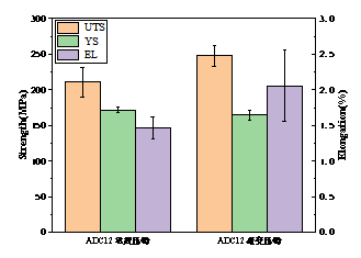 表2 金屬間化合物的EDS點分析 2.4 力學(xué)性能 圖9為ADC12常規(guī)壓鑄與流變壓鑄試樣在相同位置取樣的力學(xué)性能。可以看出,流變壓鑄的鋁合金抗拉強度 為248 MPa,明顯優(yōu)于常規(guī)壓鑄的鋁合金的210.7 MPa。同時,屈服強度變化相對較小,兩者的屈服強度比較接近。還可以看出,流變壓鑄的伸長率為2.05%,也略優(yōu)于常規(guī)壓鑄的1.46%。
