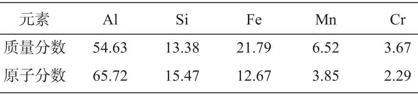圖3 壓鑄鋁合金ZL102的XRD圖譜 采用SEM進一步對上述多邊形物相進行分析,如圖4所示。基于能譜儀(EDS)結果(表2),推測其為一種復雜的AiSiFeMn四元金屬間化合物。結合部分文獻如袁、王等判斷該物相為α-Al 15 (Mn、Fe) 3 Si 2 ,該物相是在β-Al 5 FeSi 相基礎上加入Mn元素后進一步演變而成。在β-Al 5 FeSi 相形成時,部分Mn原子奪去了Fe原子在β相中占據的位置,相當于Mn原子部分替代Fe原子,從而形成了AlSiFeMn四元復合相。