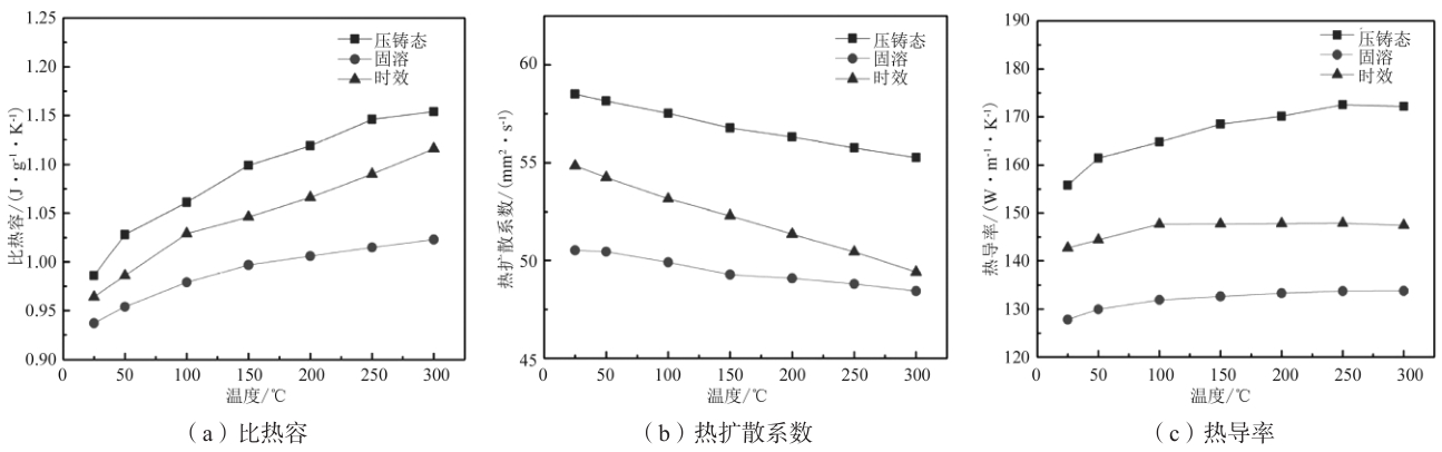圖6 熱處理對壓鑄鋁合金ZL102力學性能的影響 圖7顯示了試驗測得的不同溫度及熱處理工藝對壓鑄鋁合金ZL102導熱性能的影響。首先可以看到,壓鑄態、固溶及時效三種狀態下合金的熱導率均隨著溫度的升高而提高,由室溫至300 ℃呈現出先快速增長后緩慢增長的趨勢。這種變化趨勢主要與合金的導熱機理有關,對于一般金屬而言,熱導率由電子熱導率與聲子熱導率組成,相應的,熱阻也分為電子熱阻與聲子熱阻。電子熱阻是由電子被各種介質散射所引起的,由電子-聲子散射和電子-缺陷散射組成。聲子熱阻也由兩種過程決定:一是由于晶格的非線性振動引起的聲子之間的碰撞;二是聲子與固體中的缺陷發生的碰撞。在溫度較低時,晶格上的原子振動幅度非常小,聲子對于熱導率的貢獻不大,以電子熱導率為主,此時合金的熱導率主要由電子和缺陷的相互作用所決定。而合金內部缺陷的數量在低溫區基本不隨溫度的變化而變化,且電子的運動速率不管是在高溫還是低溫區基本保持不變,此時電子的平均自由程就可近似的認為是一個常數,這時候合金的熱導率主要由比熱決定,而比熱與溫度呈一次方的關系,所以三種熱處理狀態下合金的熱導率在開始時,均隨著溫度的升高而快速增長。隨著溫度的繼續升高,三種熱處理狀態下合金中原子的振動慢慢加劇,這時候聲子對于電子的散射作用開始增強,電子被散射的幾率增加,電子的平均自由程開始下降,從而導致了合金熱導率隨溫度繼續升高而緩慢增長。
