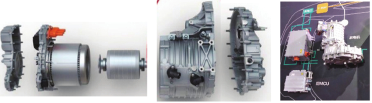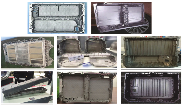 圖6 三種車(chē)型動(dòng)力及傳動(dòng)系統(tǒng)的壓鑄件應(yīng)用指數(shù) 電動(dòng)車(chē)雖然在動(dòng)力和傳動(dòng)系統(tǒng)方面壓鑄件的用量減少,但在三電系統(tǒng)中增加了壓鑄件的用量,可以部分的彌補(bǔ)動(dòng)力和傳動(dòng)系統(tǒng)壓鑄件用量的減少,典型的應(yīng)用是電池托架,如圖7所示。電動(dòng)車(chē)的不斷增加,電池箱和電機(jī)外殼的平均用鋁量將快速增長(zhǎng),電池箱用鋁量占未來(lái)鋁用量平均增量的近三分之二。為增加電池容量,目前車(chē)載電池的尺寸較大,電池托架的尺寸較大,有的型號(hào)長(zhǎng)度尺寸可達(dá)2 m,使用的壓鑄機(jī)大多都在4 000 t以上,最大可達(dá)萬(wàn)噸級(jí)的要求。此外,電機(jī)殼、端蓋、轉(zhuǎn)子、接線盒外殼等也采用壓鑄工藝生產(chǎn),對(duì)壓鑄件用量有所彌補(bǔ),見(jiàn)圖8。
