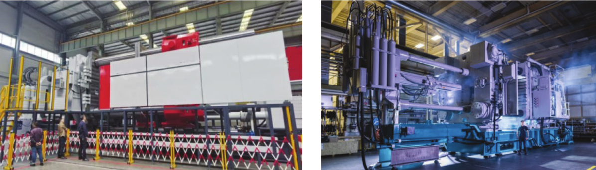 圖12 一體化壓鑄的高度集成 2.4 推動(dòng)超大型壓鑄機(jī)市場(chǎng) 多大噸位的壓鑄機(jī)屬于超大型壓鑄機(jī)在專(zhuān)業(yè)上并沒(méi)有嚴(yán)格定義,一般認(rèn)為能夠壓鑄車(chē)身大型一體化后部件的壓鑄機(jī)就認(rèn)為是超大型壓鑄機(jī),合模力在6 000 t以上。一體化車(chē)身壓鑄件重量一般可達(dá)60余公斤,澆注重量可達(dá)100余公斤,尺寸約為1 700 mm× 1 500 mm×800 mm,重量和尺寸都超出了壓鑄產(chǎn)品的極限。在此背景下,制造超大型壓鑄機(jī)成為必然。大型一體化壓鑄開(kāi)啟了壓鑄機(jī)超大型化的時(shí)代,一體化壓鑄概念提出的短短3年中,壓鑄機(jī)制造企業(yè)快速研發(fā),6 000 t超大型壓鑄機(jī)已用于生產(chǎn)汽車(chē)部件一體化壓鑄。8 000 t級(jí)、9 000 t級(jí)超大型壓鑄機(jī)已經(jīng)進(jìn)入市場(chǎng)并可在短時(shí)間內(nèi)形成生產(chǎn)能力,15 000 t級(jí)也已進(jìn)入研發(fā)設(shè)計(jì)階段,圖13為9 000 t級(jí)壓鑄機(jī)。汽車(chē)主機(jī)廠對(duì)一體化壓鑄的認(rèn)可將會(huì)使一體化壓鑄進(jìn)一步普及,大型壓鑄機(jī)市場(chǎng)需求將會(huì)進(jìn)入常態(tài)化需求,持續(xù)存在。