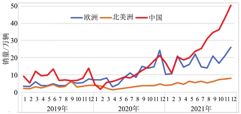 圖1 中國(guó)和歐洲、北美洲新能源汽車(chē)銷(xiāo)量走勢(shì)