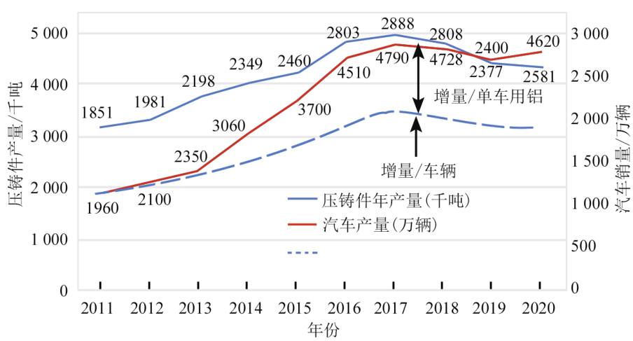 圖3 中國(guó)新能源汽車(chē)滲透率增長(zhǎng)曲線 從新能源車(chē)的區(qū)域市場(chǎng)走勢(shì)看,2020年中國(guó)和歐洲是加速上行。2021年歐洲新能源車(chē)市場(chǎng)總體高位穩(wěn)定,而中國(guó)新能源車(chē)市場(chǎng)2021年繼續(xù)上揚(yáng),且后半年走勢(shì)最為強(qiáng)勁。北美市場(chǎng)新能源車(chē)相對(duì)低迷,但仍然呈小幅增長(zhǎng)趨勢(shì)。截至2021年底,全球廣義新能源乘用車(chē)銷(xiāo)量達(dá)到937萬(wàn)輛,其中插混、純電動(dòng)、燃料電池的狹義新能源車(chē)全球銷(xiāo)量達(dá)到623萬(wàn)輛,同比增長(zhǎng)118%。中國(guó)新能源汽車(chē)銷(xiāo)量達(dá)到352萬(wàn)輛,創(chuàng)歷史新高,增長(zhǎng)率高達(dá)157.2%。目前,中國(guó)新能源乘用車(chē)銷(xiāo)量在全球占據(jù)53%的市場(chǎng)份額,電動(dòng)車(chē)更是占據(jù)61%的市場(chǎng)份額。 世界新能源車(chē)滲透率總體呈現(xiàn)快速提升趨勢(shì),今年已經(jīng)達(dá)到7%水平,其中中國(guó)新能源汽車(chē)滲透率達(dá)到12%以上,德國(guó)達(dá)到22%,挪威達(dá)到69%,美國(guó)達(dá)到4%。雖然世界新能源發(fā)展的不均衡,但總體上升趨勢(shì)明顯。隨著美國(guó)加大新能源的滲透,世界新能源車(chē)進(jìn)入強(qiáng)勢(shì)發(fā)展的新階段。 中國(guó)新能源汽車(chē)保有量已達(dá)784萬(wàn)輛,占汽車(chē)總量的2.60%,與上年相比增長(zhǎng)59.25%。其中,純電動(dòng)汽車(chē)保有量640萬(wàn)輛,占新能源汽車(chē)總量的81.63%。2021年全國(guó)新注冊(cè)登記新能源汽車(chē)295萬(wàn)輛,占新注冊(cè)登記汽車(chē)總量的11.25%,與上年相比增加178萬(wàn)輛,增長(zhǎng)151%以上。同時(shí)有機(jī)構(gòu)預(yù)測(cè)2022年中國(guó)新能源汽車(chē)銷(xiāo)量將達(dá)到500萬(wàn)輛以上,同比增長(zhǎng)42%,市場(chǎng)滲透率有望超過(guò)18%。 汽車(chē)屬于耐用消費(fèi)品,符合“S”曲線發(fā)展規(guī)律。有學(xué)者指出,如果一個(gè)新興產(chǎn)業(yè)的發(fā)展符合“S”型曲線的發(fā)展規(guī)律,當(dāng)市場(chǎng)占比超過(guò)10%以后就會(huì)形成內(nèi)部正向推動(dòng)力和性?xún)r(jià)比持續(xù)提升,緊接著該產(chǎn)業(yè)就會(huì)以較快的速度生長(zhǎng)。據(jù)此經(jīng)驗(yàn)判斷,全球汽車(chē)電動(dòng)化已突破臨界點(diǎn),進(jìn)入陡峭增長(zhǎng)期。新能源汽車(chē)從政府驅(qū)動(dòng)、市場(chǎng)與政府雙驅(qū)動(dòng),逐步轉(zhuǎn)型到市場(chǎng)驅(qū)動(dòng)為主導(dǎo)的階段。 銷(xiāo)售數(shù)據(jù)和增長(zhǎng)趨勢(shì)等數(shù)據(jù)表明,新能源汽車(chē)已經(jīng)具備強(qiáng)大的市場(chǎng)能力。可以預(yù)見(jiàn),在未來(lái)幾年中,新能源汽車(chē)產(chǎn)銷(xiāo)量足以改變汽車(chē)產(chǎn)業(yè)格局。 2、對(duì)壓鑄業(yè)的推動(dòng) 2.1 加快和提升鋁合金結(jié)構(gòu)件的應(yīng)用 新能源汽車(chē)取代傳統(tǒng)燃油車(chē),需要重大的技術(shù)突破,其中一個(gè)重點(diǎn)內(nèi)容是增加續(xù)航里程。目前看來(lái),突破這一困境的關(guān)鍵首先是研發(fā)高能量電池或其他新能源,其次是車(chē)輛輕量化。在傳統(tǒng)燃油車(chē)輕量化的過(guò)程中,壓鑄以其精凈成形、筋肋結(jié)構(gòu)、高度集成、易于處理以及高效率等一系列優(yōu)勢(shì)發(fā)揮了重要作用,取代了諸多黑色金屬鑄件,拓展了壓鑄件的應(yīng)用范圍。進(jìn)入新能源汽車(chē)階段,對(duì)輕量化的要求更加突出和迫切。新能源的汽車(chē)推動(dòng)了輕量化進(jìn)程,推動(dòng)了壓鑄結(jié)構(gòu)件的應(yīng)用。 鋁合金壓鑄件主要用于汽車(chē)、機(jī)械、電子、通訊、儀器儀表、家用電器等領(lǐng)域,其中汽車(chē)零部件占比最大,約占70%。汽車(chē)產(chǎn)業(yè)是壓鑄業(yè)的支柱產(chǎn)業(yè),壓鑄件產(chǎn)量與汽車(chē)產(chǎn)量呈顯著的正相關(guān)性,近年壓鑄件產(chǎn)量與汽車(chē)產(chǎn)量的走勢(shì)見(jiàn)圖4。由于汽車(chē)產(chǎn)量的持續(xù)走高,帶動(dòng)壓鑄件產(chǎn)量上升,連續(xù)十余年增量超過(guò)10%。由圖4可看出,壓鑄件的增量由兩部分組成,一部分是汽車(chē)產(chǎn)量增加,拉動(dòng)壓鑄件產(chǎn)量增加,另一部分則是由于汽車(chē)單車(chē)壓鑄件用量增加所拉動(dòng)。單車(chē)壓鑄件用量增加,其中一個(gè)重要原因是近年新能源汽車(chē)的發(fā)展,加速了結(jié)構(gòu)件的應(yīng)用。尤其是2020年,在汽車(chē)銷(xiāo)量下降的情況下,壓鑄件產(chǎn)量逆勢(shì)上揚(yáng),主要原因也應(yīng)該是結(jié)構(gòu)件用量做出了很大貢獻(xiàn)。2021年上升趨勢(shì)會(huì)更加明顯,表明新能源汽車(chē)對(duì)結(jié)構(gòu)件應(yīng)用具有顯著的推動(dòng)力。