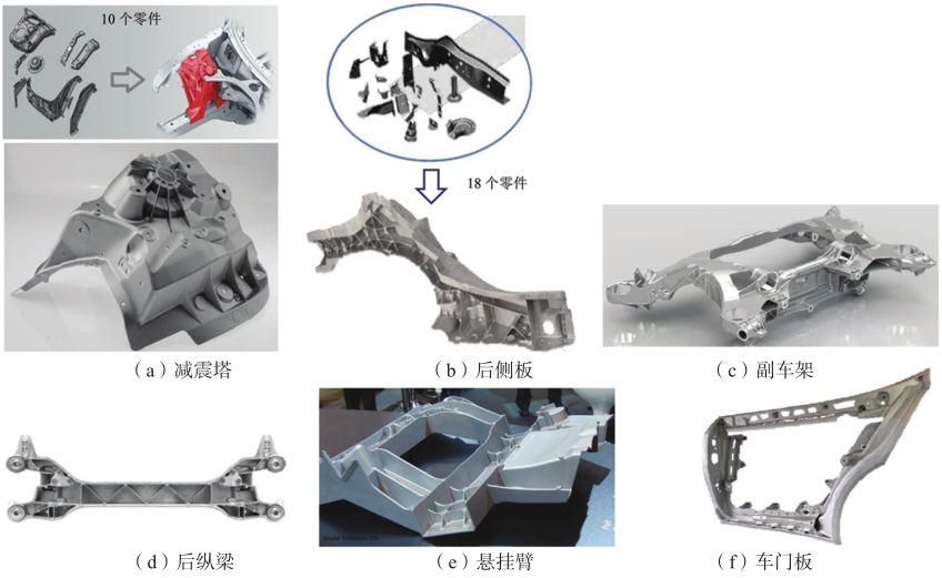 圖4 壓鑄件產(chǎn)量與汽車(chē)產(chǎn)量走勢(shì) 目前,汽車(chē)結(jié)構(gòu)件壓鑄生產(chǎn)技術(shù)已經(jīng)取得長(zhǎng)足進(jìn)步,從初期的A柱、減震塔等結(jié)構(gòu)件批產(chǎn)后,已經(jīng)擴(kuò)展至后側(cè)梁、副車(chē)架等工藝難度比較大的結(jié)構(gòu)件,典型的結(jié)構(gòu)件見(jiàn)圖5。其中減震塔原為10個(gè)零件組成,改為壓鑄工藝生產(chǎn)后集成為一件。后縱梁原為18個(gè)零件組成,壓鑄后集成為一件。副車(chē)架壓鑄工藝難度大,此前大部分采用低壓工藝或重力工藝,改為壓鑄后,形狀及尺寸精確,壁厚減薄,重量減輕,大幅提高生產(chǎn)效率。懸掛臂和后縱梁等鑄件性能要求比較高,一般需要進(jìn)行熱處理。目前,結(jié)構(gòu)件壓鑄基本上采用真空壓鑄,保證鑄件的可熱處理和可焊接性能。