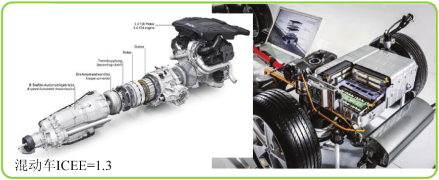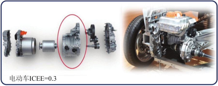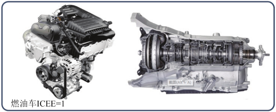 圖5 典型的結(jié)構(gòu)件 2.2 壓鑄件應(yīng)用轉(zhuǎn)換 壓鑄件在傳統(tǒng)燃油車(chē)與新能源汽車(chē)中有些部位的用量產(chǎn)生變化,壓鑄件用量有增有減,變化主要來(lái)自動(dòng)力系統(tǒng)和傳動(dòng)系統(tǒng)。在燃油車(chē)中,動(dòng)力和傳動(dòng)系統(tǒng)包括發(fā)動(dòng)機(jī)缸體、變速箱和離合器殼體等這部分壓鑄件用量比較大,發(fā)動(dòng)機(jī)約有16個(gè)壓鑄件,傳動(dòng)系統(tǒng)約有8個(gè)壓鑄件。但在電動(dòng)車(chē)中,驅(qū)動(dòng)系統(tǒng)約有4個(gè)壓鑄件,傳動(dòng)系統(tǒng)約有2個(gè)壓鑄件。電動(dòng)汽車(chē)與傳統(tǒng)燃油車(chē)相比,在動(dòng)力系統(tǒng)和傳動(dòng)系統(tǒng)中的應(yīng)用明顯減少。但新能源汽車(chē)中混合動(dòng)力汽車(chē)的動(dòng)力和傳動(dòng)系統(tǒng)包含了燃油和電動(dòng)兩套系統(tǒng),壓鑄件的用量有所增加。如果用ICEE(壓鑄機(jī)鎖模力(循環(huán)時(shí)間)表示壓鑄件的應(yīng)用指數(shù),大小及數(shù)量因素等),則燃油車(chē)、電動(dòng)車(chē)和混動(dòng)車(chē)的壓鑄件應(yīng)用指數(shù)如圖6所示。