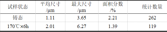 圖5 不同狀態(tài)下AlSi7CuMnMg合金的SEM組織 為進(jìn)一步分析時(shí)效處理后合金中第二相的變化情況,采用Image-Pro Plus軟件統(tǒng)計(jì)了圖5合金組織中第二相的晶粒尺寸和面積分?jǐn)?shù),結(jié)果見表6。結(jié)合表6可看出,時(shí)效處理后,分布在基體的第二相數(shù)量減少,尺寸增大,最大達(dá)到了6.27,其平均晶粒尺寸由鑄態(tài)時(shí)的1.11增加至2.01,主要以塊狀、原點(diǎn)狀富集在各晶粒交界處,少數(shù)沿晶界呈網(wǎng)狀分布。合金經(jīng)過(guò)170 ℃×6 h的時(shí)效處理后,第二相質(zhì)點(diǎn)在-Al基體和共晶硅相之間聚集長(zhǎng)大,能夠更加牢固地釘扎位錯(cuò),同時(shí)位錯(cuò)切過(guò)第二相粒子增加新的界面能,屈服強(qiáng)度得到有效提高;隨著第二相的聚集和粗化,合金的塑性逐漸下降。