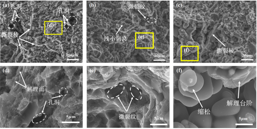表6 圖5中第二相晶粒尺寸及面積分?jǐn)?shù)統(tǒng)計(jì) 圖7為不同狀態(tài)下AlSi7CuMnMg合金經(jīng)室溫拉伸后的斷口形貌對(duì)比圖。從圖8a~圖8c中可看到粗大條狀的撕裂棱,數(shù)條相間分布的撕裂棱形成河流花樣的斷口形貌,在高倍下可觀察到大面積的解理面,拉伸變形在有缺陷的地方產(chǎn)生應(yīng)力集中,從而形成微裂紋。裂紋首先在晶粒內(nèi)部長(zhǎng)大,隨后沿著晶界向相鄰晶粒擴(kuò)展形成解離平面,這為典型的脆性斷裂特征。還存在著一些淺小稀疏的韌窩,韌窩的尺寸大小由材料本身塑性變形的能力和第二相的大小和密度所決定,這表明AlSi7CuMnMg合金經(jīng)低溫時(shí)效處理后室溫拉伸的斷裂方式為混合斷裂。圖8f所呈現(xiàn)出的斷口組織中出現(xiàn)了典型的顯微縮松形貌,這是由于壓鑄過(guò)程中金屬液凝固產(chǎn)生收縮而形成,由于冷卻速度不均勻,鑄件表面和先接近模具的地方快速冷卻凝固,阻礙了后續(xù)金屬液的補(bǔ)縮通道,使鑄件內(nèi)部產(chǎn)生縮松孔洞,對(duì)合金力學(xué)性能造成不利影響。