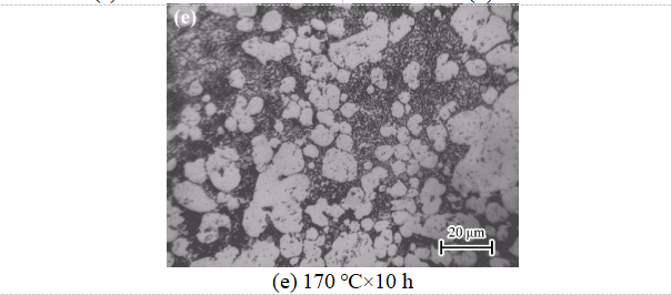 圖7 不同時(shí)效時(shí)間下AlSi7CuMnMg合金的金相組織(OM) 3、結(jié)論 (1)隨著時(shí)效溫度升高,AlSi7CuMnMg鋁硅合金的屈服強(qiáng)度明顯提高,在180 ℃為189 MPa,但伸長(zhǎng)率下降;保持時(shí)效溫度不變,延長(zhǎng)時(shí)效時(shí)間,屈服強(qiáng)度提高得更為顯著,在10 h時(shí)達(dá)到198 MPa,但抗拉強(qiáng)度變化不大。 (2)綜合各項(xiàng)力學(xué)性能,可確定AlSi7CuMnMg壓鑄鋁硅合金最佳低溫時(shí)效工藝為170 ℃×6 h,在此狀態(tài)下屈服強(qiáng)度達(dá)183 MPa,較原始鑄態(tài)樣提高40.77%,伸長(zhǎng)率為7.5%,強(qiáng)韌化指數(shù)達(dá)到最高值1.039。 (3)時(shí)效過(guò)程中,第二相在晶界處聚集粗化釘扎位錯(cuò),增加了材料變形時(shí)的阻力,合金強(qiáng)度得到有效提高。