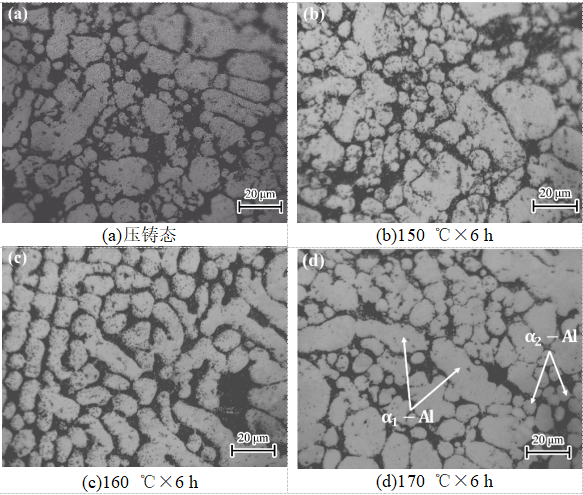 表4 不同時(shí)效時(shí)間下AlSi7CuMnMg合金力學(xué)性能 2.2 時(shí)效處理對(duì)AlSi7CuMnMg鋁硅合金組織的影響 2.2.1 不同時(shí)效溫度對(duì)合金組織的影響 圖2為保溫6 h不同時(shí)效溫度下AlSi7CuMnMg合金的金相組織。可以看出,不同時(shí)效制度下合金的顯微組織差別不大,主要由大量白色塊狀、棒狀的α-Al基體和呈黑色細(xì)小顆粒狀、層片狀的α-Al+Si共晶硅組成;共晶硅相分布在晶粒邊界處,各晶粒間尺寸分布不均勻,呈團(tuán)簇狀分布的1-Al是在合金進(jìn)入壓室內(nèi)產(chǎn)生的,由于冷卻速度較慢,晶粒有足夠的時(shí)間長(zhǎng)大,故其尺寸較大,表現(xiàn)出明顯的樹枝晶特征;而2-Al形成時(shí)其冷卻凝固速率相對(duì)較快,組織呈細(xì)小顆粒狀等軸分布,見圖4d。另外,金相組織中還存在著少量淺灰色細(xì)小圓塊狀含錳相,鑄態(tài)下,這些含錳相尺寸較小,主要分布于晶界處,經(jīng)過(guò)低溫人工時(shí)效處理后,含錳相逐漸長(zhǎng)大,開始聚集粗化,這些細(xì)小含錳相的聚集能夠釘扎位錯(cuò),阻礙變形時(shí)位錯(cuò)的滑移,提高材料的屈服強(qiáng)度。