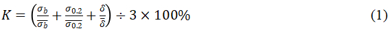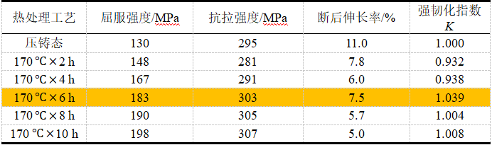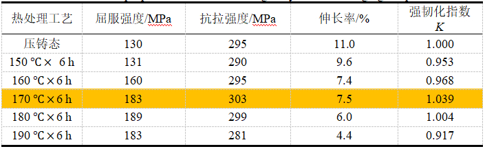 表2 時(shí)效處理方案 對(duì)不同時(shí)效處理的試樣在電子萬(wàn)能試驗(yàn)機(jī)上進(jìn)行力學(xué)性能測(cè)試,拉伸速度為1mm/min,每組試驗(yàn)設(shè)定3個(gè)平行試樣,取其平均值;用數(shù)控線切割加工截取1010mm的圓柱體試樣,經(jīng)400號(hào)、800號(hào)、1200號(hào)水磨砂紙粗磨,隨后經(jīng)400號(hào)、800號(hào)、1200號(hào)金相砂紙細(xì)磨,用研磨膏拋光,所選拋光膏顆粒度為0.5,用keller試劑(2mL HF+3mL HCl+5mL HNO3+190mL H2O)腐蝕5 s后用水沖洗,再用酒精清洗并吹干,在Leica DM IRM 型光學(xué)顯微鏡(OM) 下觀察顯微組織;采用JEOL JXA-8100 型掃描電鏡(SEM)觀察合金的微觀組織及其拉伸斷口形貌,并利用其配備的OXFORD-7412型能譜儀(EDS)分析合金成分;結(jié)合Jade6.0軟件,利用X射線衍射儀對(duì)試樣進(jìn)行物相分析。 2、試驗(yàn)結(jié)果及討論 2.1 時(shí)效處理對(duì)AlSi7CuMnMg鋁硅合金力學(xué)性能的影響 2.1.1 不同時(shí)效溫度對(duì)合金力學(xué)性能的影響 取5組試樣分別對(duì)其進(jìn)行不同的時(shí)效處理,時(shí)效時(shí)間為6 h,時(shí)效溫度為150、160、170、180、190 ℃,其力學(xué)性能與時(shí)效制度的關(guān)系見圖2和表3。從表3可看出,隨著時(shí)效溫度升高,材料的屈服強(qiáng)度明顯提高;時(shí)效溫度為150 ℃時(shí),相比于壓鑄態(tài)變化不明顯,當(dāng)溫度提高到160 ℃時(shí),達(dá)到了160 MPa,相比于150 ℃時(shí)的試樣提高了22%;在時(shí)效溫度為180 ℃時(shí),試樣的屈服強(qiáng)度達(dá)到189 MPa,在壓鑄態(tài)基礎(chǔ)上提高了45%。由表3可知,時(shí)效溫度在升至170℃前,材料的屈服強(qiáng)度隨溫度升高而提高,而當(dāng)時(shí)效溫度達(dá)到170℃后,溫度繼續(xù)上升,屈服強(qiáng)度變化不大,溫度為190 ℃時(shí),合金進(jìn)入過(guò)時(shí)效階段,屈服強(qiáng)度開始下降。材料的抗拉強(qiáng)度隨時(shí)效溫度的升高變化不大,時(shí)效溫度為170 MPa時(shí)達(dá)到峰值303 MPa;隨后材料的抗拉強(qiáng)度有所下降,190 ℃時(shí)降至281 MPa。隨著時(shí)效溫度升高,伸長(zhǎng)率從鑄態(tài)的11%下降至?xí)r效溫度為190℃時(shí)的4.3%。為了更直觀地表示不同熱處理制度對(duì)AlSi7CuMnMg合金強(qiáng)塑性的影響程度,引入強(qiáng)韌化指數(shù)K,K值的大小以相同的強(qiáng)度、塑性為前提,強(qiáng)度越高、塑性越好,則K值越大。以AlSi7CuMnMg壓鑄態(tài)不做任何熱處理時(shí)的力學(xué)性能作為比較標(biāo)準(zhǔn),則強(qiáng)韌化指數(shù)K值的數(shù)學(xué)表達(dá)式為: