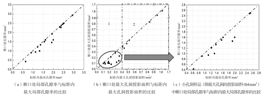 圖7 15號試樣中孔洞的形貌和分布 2.3 孔洞特征參數與斷裂位置 為了探明試樣局部孔隙率和試樣內部最大孔洞對試樣斷裂位置的影響,將試樣最大的局部孔隙率和最大孔洞的投影面積與斷口處的數據進行了對比分析。將每個試樣斷口處的局部孔隙率與試樣標距內的局部最高孔隙率進行比較,可得到試樣斷口處局部孔隙率與標距內最高局部孔隙率的關系,19個試樣的分析結果如圖8a所示。將斷口處的最大孔洞投影面積與整體最大孔洞的投影面積進行比較,可得到試樣斷口處最大孔洞與試樣內部最大孔洞的關系,19個試樣的比較結果如圖8b所示。 圖8a中可看出,19個樣品中有13個樣品的數據點落在X=Y的直線上(即對角線上),表明這13個樣品的斷口所在單元的局部孔隙率與標距內的最大局部孔隙率相同,而其余6個數據點未落在X=Y直線上的點則落在直線X=Y附近,表示這部分樣品的斷裂處的局部孔隙率稍低于標距內最高孔隙率,但差異較小。可以觀察到,19個樣品的標距內最高局部孔隙率與斷口處局部孔隙率之間呈現明顯的相關性。而圖8b中可以看出,當最大孔洞的投影面積>0.4 mm 2 (區域2)時,點落在直線X=Y上,標距內最大孔洞的投影面積與斷口處局部最大孔洞的投影面積呈明顯相關性,但是當樣品內部沒有大孔洞存在時,即最大孔洞的投影面積<0.4 mm 2時(區域1,共12個試樣),未觀察到明顯的相關性。而這12個沒有大孔洞的樣品(區域1)中,標距內最高局部孔隙率與斷口處局部孔隙率之間仍舊呈現明顯的相關性,如圖8c所示。表明局部孔隙率是決定斷裂位置的關鍵因素。