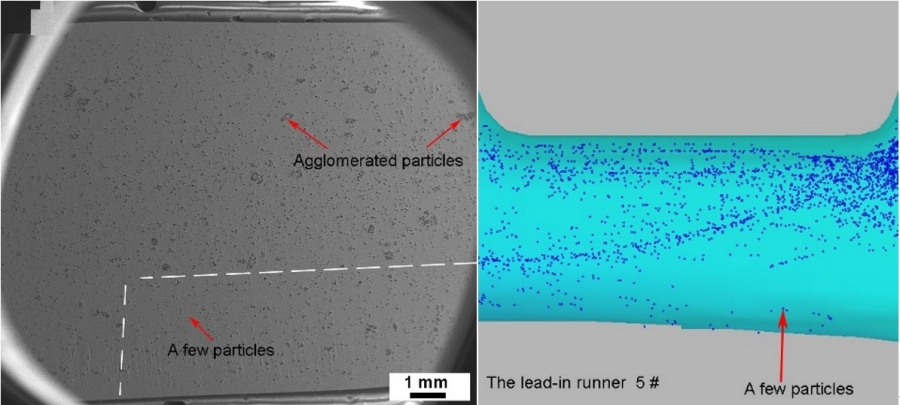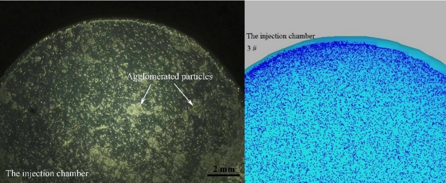 式中,μc為復(fù)合材料粘度,ρc為復(fù)合材料密度,u為熔體速度,?為普朗特流體混合長(zhǎng)度,x為流體離型壁的距離。本研究中壓室與內(nèi)澆口截面積比為32:1,模擬結(jié)果顯示熔體通過(guò)內(nèi)澆口后速度急劇增大(見(jiàn)圖8a),產(chǎn)生強(qiáng)大的流體剪切力能夠?qū)㈩w粒團(tuán)簇破碎分散。不同的是,數(shù)值模擬過(guò)程未能考慮復(fù)合材料熔體攪拌制備過(guò)程中所產(chǎn)生的顆粒團(tuán)簇現(xiàn)象,因而壓室與分流道內(nèi)不存在大尺寸的顆粒團(tuán)簇。此外,尚未探討顆粒對(duì)熔體粘度、導(dǎo)熱系數(shù)及熱焓等的影響,因此,后續(xù)研究將結(jié)合實(shí)驗(yàn)調(diào)整上述相關(guān)物理性參數(shù),對(duì)所構(gòu)建的數(shù)學(xué)模型進(jìn)行優(yōu)化。