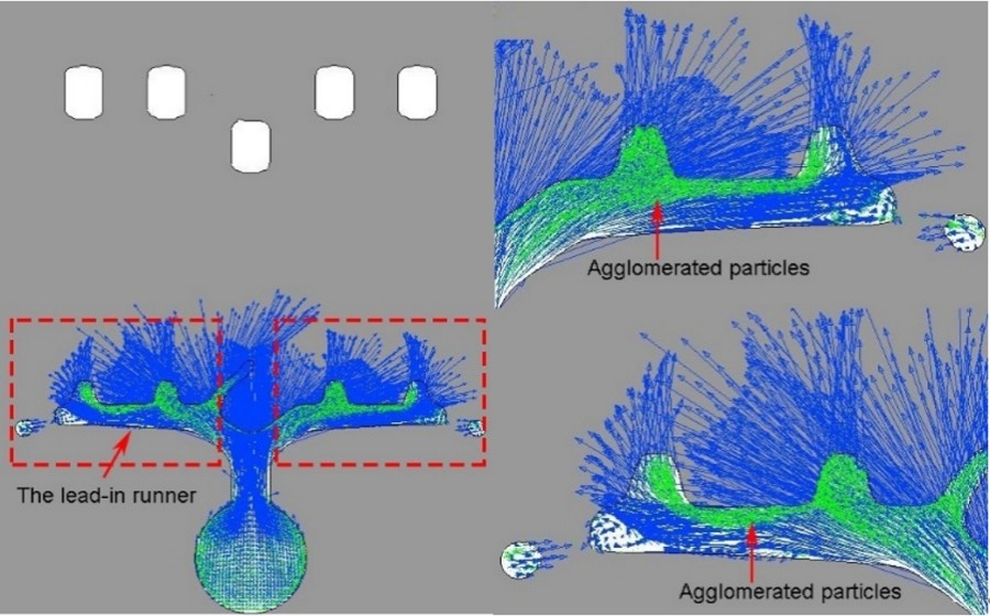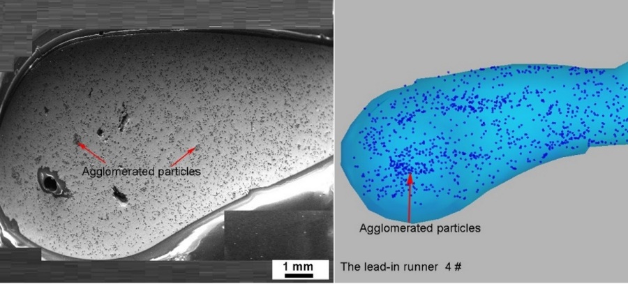 (c)試件 (d)溢流槽 3.結(jié)論 (1)基于分散相粒子模型,構(gòu)建了B4C/A356復(fù)合材料壓鑄成形過(guò)程的多相流數(shù)學(xué)模型,不同位置處顆粒分布形態(tài)的模擬結(jié)果與試驗(yàn)相符合,可為PAMCs鑄造成形工藝優(yōu)化以改善組織與性能提供數(shù)值模擬方法。 (2)充型過(guò)程中溢流槽內(nèi)所形成的局部環(huán)流,增大了顆粒發(fā)生碰撞的幾率,導(dǎo)致顆粒團(tuán)聚;不同位置的溢流槽內(nèi)形成了數(shù)目不等的局部環(huán)流,其數(shù)目的增大將加劇顆粒團(tuán)聚與分布不均現(xiàn)象。 (3)分流道內(nèi)熔體流向發(fā)生劇烈變化易將顆粒推向某一側(cè),造成顯著的分布不均現(xiàn)象,分流道末端所形成的局部環(huán)流能夠?qū)㈩w粒截留,并促使大量顆粒發(fā)生碰撞團(tuán)聚,導(dǎo)致其內(nèi)部顆粒數(shù)量較大且團(tuán)聚明顯。