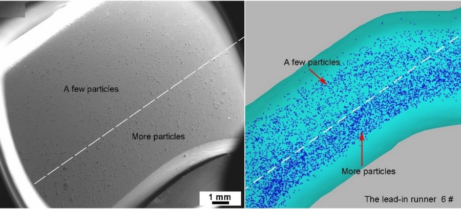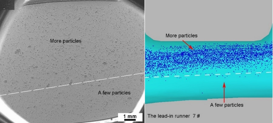 (e)實(shí)際壓鑄壓室 (f)模擬壓室 圖5為壓鑄試樣與模擬的分流道中顆粒分布對(duì)比。由圖5a和圖5b可見(jiàn),鑄件分流道位置4處顆粒數(shù)量較多,且存在明顯的顆粒團(tuán)聚現(xiàn)象,與模擬相符合。由圖5c和圖5d可見(jiàn),鑄件 分流道位置5處顆粒數(shù)量較少,且右下方出現(xiàn)顆粒空白區(qū)域,這不同于文獻(xiàn)所描述的靠近型壁兩側(cè)附近均出現(xiàn)顆粒稀少現(xiàn)象。由圖5e~圖5h可見(jiàn),鑄件分流道位置6和7處顆粒數(shù)量較多,且顆粒分布存在嚴(yán)重的分布不均現(xiàn)象,具體表現(xiàn)為位置6處上側(cè)顆粒數(shù)量較少,而下側(cè)顆粒數(shù)量較多,位置7處與位置6處的顆粒分布特征正好相反。上述對(duì)比分析表明,溢流槽和分流道中不同位置處的顆粒分布特征均存在較大差異,而研究充型過(guò)程中熔體的流動(dòng)形態(tài)方可解釋上述現(xiàn)象。