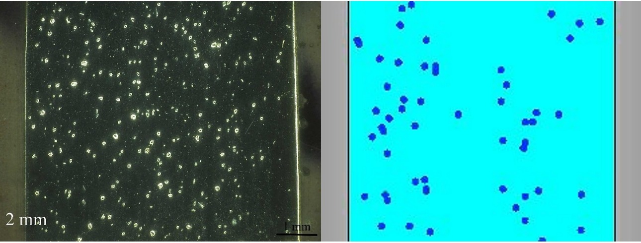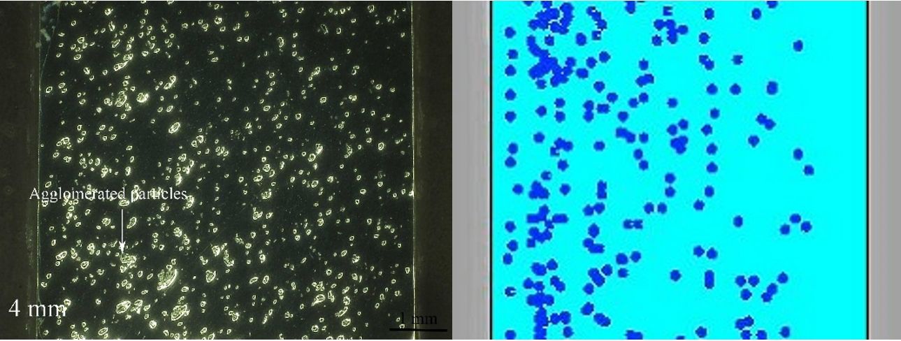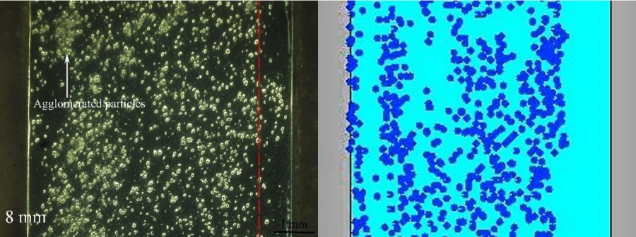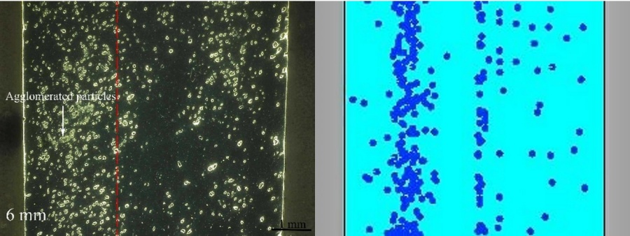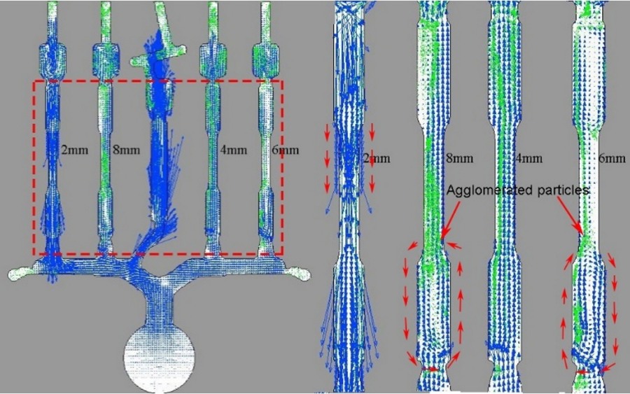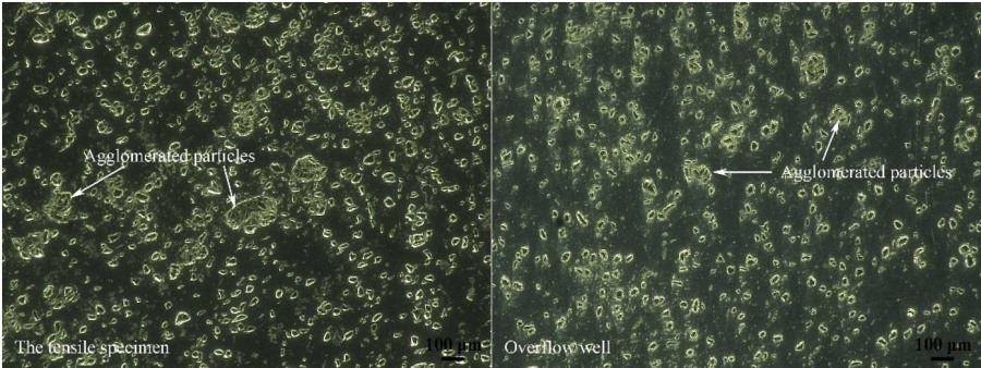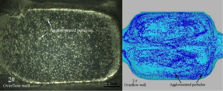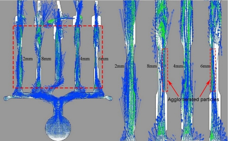 (4)2mm厚試件中熔體流向與流速變化較大,不利于顆粒沉降,導(dǎo)致試件中顆粒數(shù)量稀少;厚4mm試件中熔體流動(dòng)平穩(wěn),有利于顆粒發(fā)生沉降及分布均勻;厚6mm和8mm試件易產(chǎn)生單側(cè)流和局部環(huán)流,導(dǎo)致顆粒分布不均及及團(tuán)聚現(xiàn)象。 |