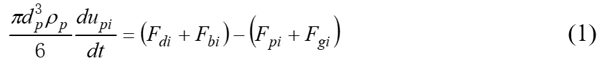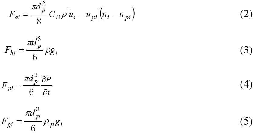 式中,dp為顆粒的粒徑,ρp為顆粒的密度,upi為顆粒的運(yùn)動(dòng)速度,F(xiàn)di為顆粒所受的流體流動(dòng)作用力,F(xiàn)bi為顆粒受到的浮力,F(xiàn)pi為顆粒受到的流體壓力梯度力,F(xiàn)gi為顆粒受到的重力作用力,具體計(jì)算如下: