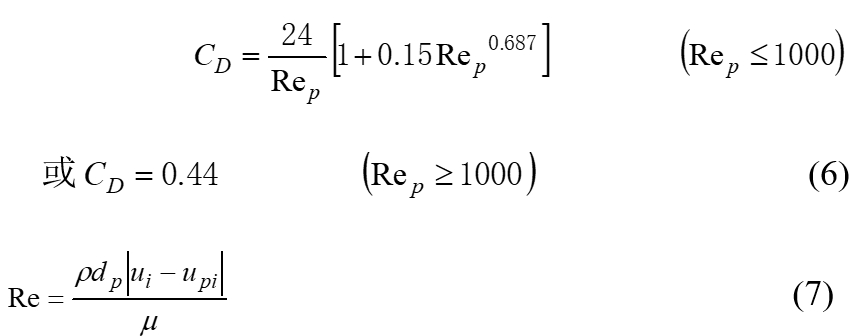 所構(gòu)建的模型中將增強(qiáng)顆粒假定為近球形,因此流體拖拽力系數(shù)CD表達(dá)式為:
