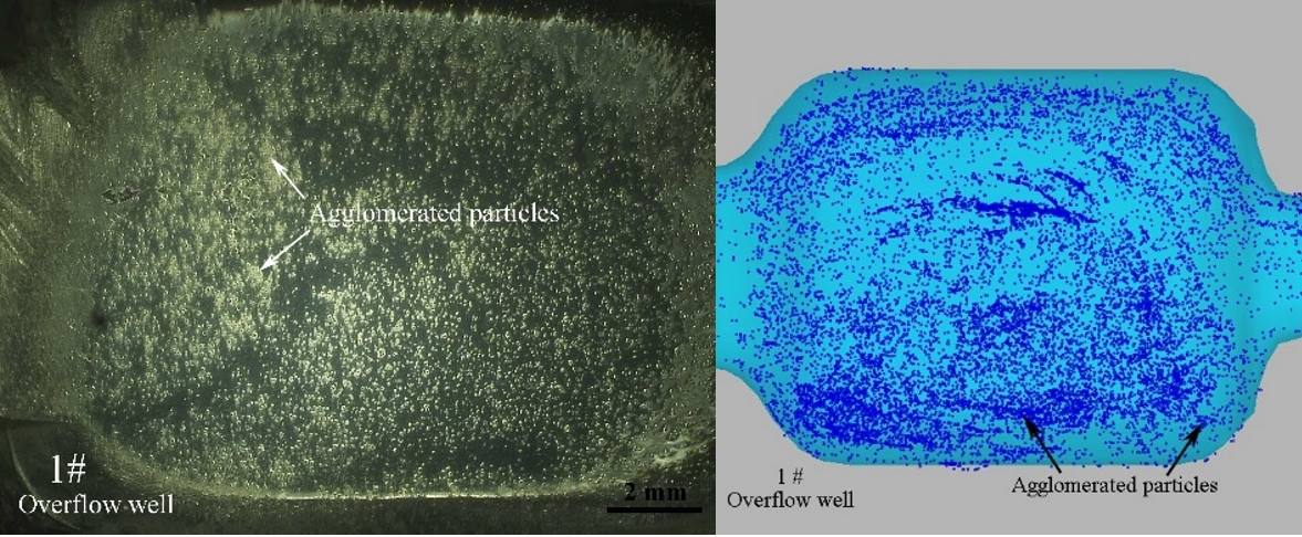 (a)實(shí)體鑄件(b)模擬鑄件 圖4為實(shí)際壓鑄與模擬壓室、溢流槽中顆粒分布對(duì)比。由圖4a~圖4d可見(jiàn),鑄件溢流槽中顆粒數(shù)量較多,出現(xiàn)了顆粒團(tuán)聚及局部區(qū)域顆粒稀少現(xiàn)象,試驗(yàn)與模擬鑄件中顆粒分布規(guī)律較符合。由圖4e和圖4f可見(jiàn),模擬鑄件壓室中顆粒分布相對(duì)較為均勻,而試驗(yàn)鑄件壓室內(nèi)存在大尺寸的團(tuán)簇顆粒,等效直徑約為400μm。這是由于所構(gòu)建的數(shù)學(xué)模型中,在參數(shù)設(shè)定時(shí)沒(méi)有考慮攪拌制備過(guò)程形成的顆粒團(tuán)聚現(xiàn)象,設(shè)定顆粒相均勻分布于壓室前端,且由于壓室中顆粒運(yùn)動(dòng)距離較短,受到熔體流動(dòng)的影響較小,因此模擬結(jié)果顯示壓室內(nèi)顆粒分布較為均勻。此外,將針對(duì)試驗(yàn)鑄件壓室與其它位置處顆粒團(tuán)聚特征的差異進(jìn)行深入分析。