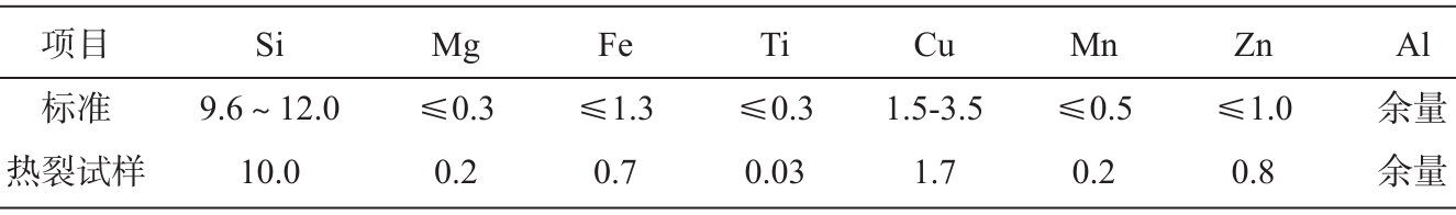 表1 ADC12合金的主要化學(xué)成分 wB/% 1.2 壓力鑄造過(guò)程 采用的壓鑄機(jī)鎖模力為300 kN,料柄厚度15 mm,模具溫度200 ℃,壓射力為330 kN,沖頭直徑為60 mm,壓射壓力116 MPa,壓射時(shí)間3.5 s,冷卻時(shí)間2.0 s,留模時(shí)間8.0 s。本試驗(yàn)通過(guò)模溫機(jī)將模具預(yù)熱至150 ℃(模具表面實(shí)測(cè)溫度),然后進(jìn)行壓鑄。壓鑄過(guò)程中模柄的動(dòng)作行程位置:一快位置為100 mm,二快位置為240 mm,增壓位置為280 mm,跟蹤位置為375 mm。所生產(chǎn)手機(jī)中框及其熱裂缺陷宏觀照片如圖1所示,從圖中可以看出,熱裂紋發(fā)生在鑄件的熱節(jié)處,這是由于在合金凝固末期,金屬液的溫度急速降低,降低了合金液的流速,極易產(chǎn)生縮松及縮孔,降低金屬液對(duì)裂紋的補(bǔ)縮效果。