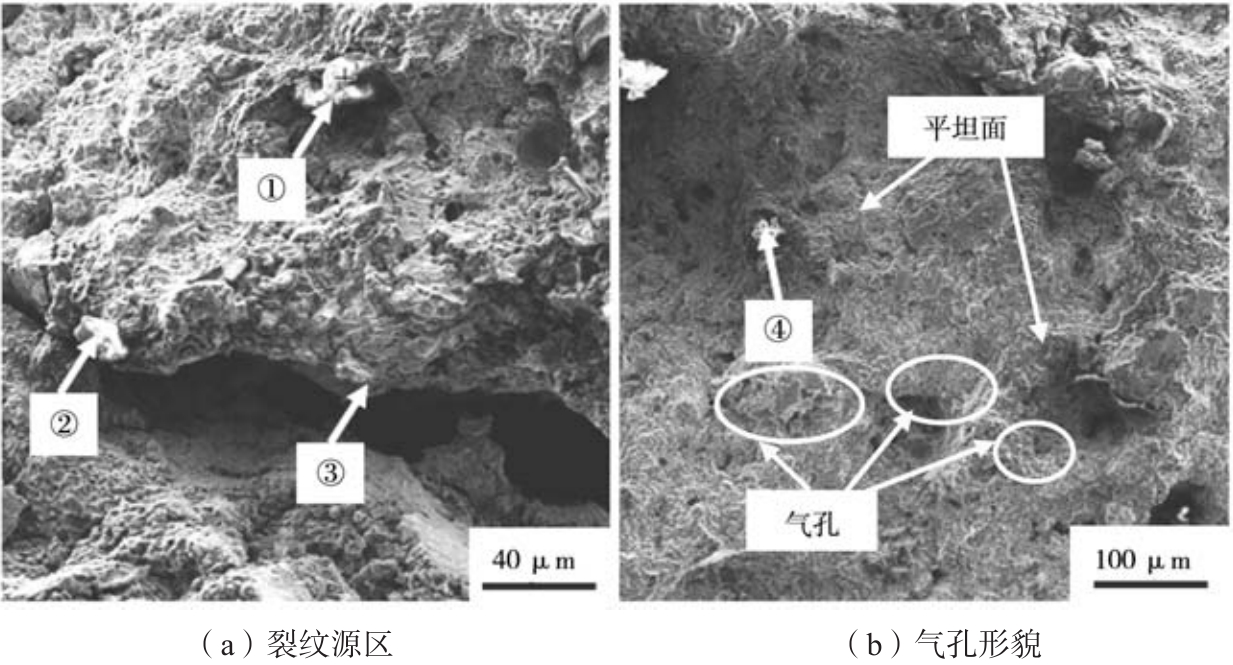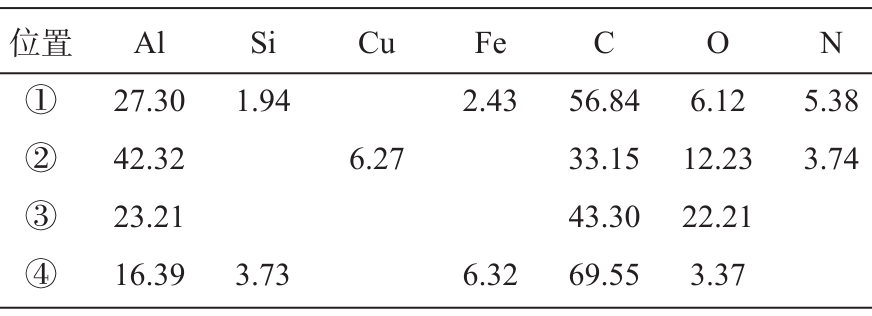 圖2 熱裂處斷口形貌特征 可以判斷出熱裂發(fā)生于晶界處,這是由于當(dāng)合金凝固至半固態(tài)階段時(shí),晶界處熱應(yīng)力逐漸增加,此時(shí)合金的強(qiáng)度極限較小,材料半固態(tài)的強(qiáng)度極限低于晶界處的熱應(yīng)力所致,即在凝固的最后階段由于收縮所產(chǎn)生的應(yīng)力應(yīng)變超過(guò)材料可承受的極限范圍,這是熱裂的主要誘因。此時(shí)產(chǎn)生的熱裂紋不能及時(shí)愈合,合金的強(qiáng)度就會(huì)下降,而熱裂紋就會(huì)發(fā)生進(jìn)一步的擴(kuò)展。從圖2b中可以看出,斷口中存在脆性斷裂區(qū)域和韌性斷裂區(qū)域,以脆性斷裂為主,斷口裂紋內(nèi)部某些區(qū)域,集中分布著大量孔洞,初步判定是氣孔,由于孔洞數(shù)量較多,且分布范圍廣,相對(duì)密集,可以判斷為壓鑄時(shí)卷氣及排氣板等廢料回用產(chǎn)生的氣孔,它們嚴(yán)重降低了合金的力學(xué)性能。而且氣孔周邊分布有大量夾雜物。圖2中各點(diǎn)的EDS微區(qū)成分分析結(jié)果見(jiàn)表2,從表2中可以看出,各點(diǎn)均含有碳、氧、氮、鋁、硅、鐵元素,推斷主要為碳氧氮夾雜物及有害鐵相(β-AlFeSi),且可以推測(cè)夾雜物來(lái)源于壓鑄過(guò)程中的輔助材料,如脫模劑、顆粒油等,導(dǎo)致試樣呈現(xiàn)脆性斷裂特征。