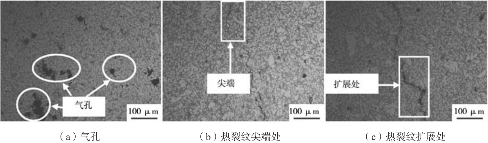 表2 圖2中各點(diǎn)的EDS分析結(jié)果 wB/% 2.2 合金的組織分析 圖3為在光學(xué)顯微鏡下觀察到的熱裂紋位置處的合金顯微組織,其金相組織由初生α-Al、α-Al+共晶硅相組成,淺顏色為基體組織,深顏色為共晶組織。圖中可見(jiàn),熱裂紋是在合金基體相的晶界上形成和發(fā)展的,裂紋剛開(kāi)始形成時(shí),晶間分離和收縮量相對(duì)較小,共晶液容易補(bǔ)縮。從圖3a中可以看出,熱裂紋處分布有大量的氣孔,惡化了合金的力學(xué)性能,這與斷口形貌中觀察到的結(jié)果一致;圖3b、c中合金的晶粒大小分布不均勻,粗大的樹(shù)枝晶與細(xì)小的球狀晶共存,大量粗大枝晶的存在導(dǎo)致合金的抗熱裂性能降低,表明此處在冷卻過(guò)程中受熱力學(xué)等因素影響,引起組織不均勻,并產(chǎn)生了較大熱應(yīng)力。由于粗大的枝晶不能像等軸晶、球狀晶那樣容易滑移而減少應(yīng)力,所以容易發(fā)生熱裂。圖3b為熱裂紋尖端處的組織,其中一部分裂紋在形成過(guò)程中部分已經(jīng)被共晶液填充補(bǔ)縮,一部分由于剩余共晶液體不足,并不能使裂紋填充補(bǔ)縮,所以導(dǎo)致裂紋斷斷續(xù)續(xù)。熱裂紋形成后,由于ADC12合金的凝固區(qū)間較窄,當(dāng)合金液的溫度快速下降時(shí),凝固速度加快,固相所占比例快速增加,導(dǎo)致合金液的充型能力大大下降,從而無(wú)法再對(duì)形成的熱裂紋進(jìn)行填充補(bǔ)縮,而且共晶液數(shù)量少于裂紋所需要的補(bǔ)縮量,致使熱裂紋已經(jīng)無(wú)法愈合,因此熱裂紋進(jìn)一步擴(kuò)展,圖3c為熱裂紋擴(kuò)展后的組織,可見(jiàn)裂紋寬度明顯增加,最寬處達(dá)20 μm。