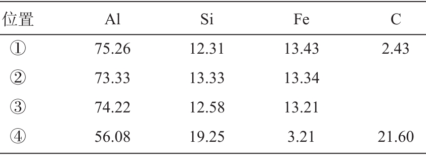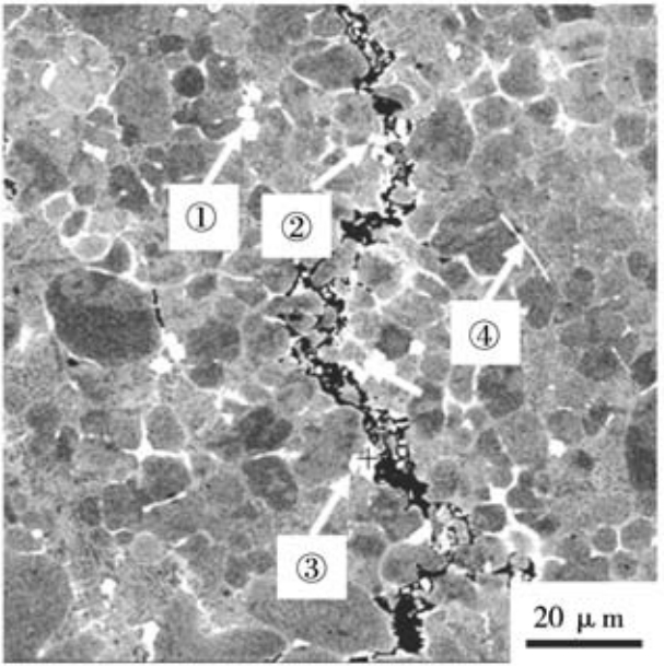 圖3 熱裂紋處合金的顯微組織 為進(jìn)一步分析熱裂處的微觀組織形貌,對(duì)合金試樣進(jìn)行掃描電鏡觀察,并對(duì)熱裂紋處的特征部位進(jìn)行能譜分析,結(jié)果分別如圖4及表3所示。可知微觀組織中白色塊狀及針狀組織的成分含有鋁、硅、鐵元素,判斷為β(Al 9 Fe 2 Si 2 )脆性相,大量尺寸較大的塊狀β-AlFeSi相在裂紋兩側(cè),且分布雜亂無(wú)章,阻塞了枝晶之間的補(bǔ)縮通道,使共晶液補(bǔ)縮較為困難,同時(shí)增加氣孔缺陷,因?yàn)?beta;-AlFeSi相有著較小的氣體-固體界面能,所以氣孔容易沿著β鐵相形核并長(zhǎng)大。另外,粗大的有害鐵相會(huì)對(duì)合金的補(bǔ)縮造成影響,阻塞了液體補(bǔ)縮的通道,因而進(jìn)一步增加合金的熱裂傾向 。