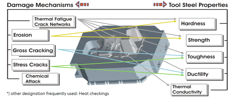 在模具溫度場無法達到較理想狀態的生產條件下,Bohler W400VMR +氮化/涂層,高韌性、高延展性材料輔以表面處理可以提高抵抗疲勞裂紋出現的能力。
