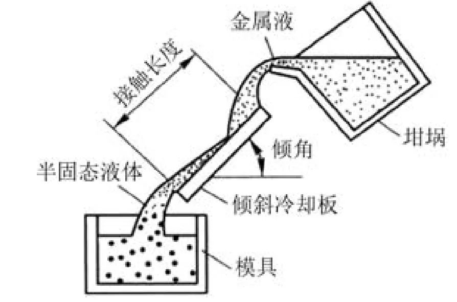 圖1 傾斜冷卻板制漿法工藝示意圖 AlSi9Cu合金熔化脫氣后,將熔體溫度分別調(diào)節(jié)至700 ℃、690 ℃和680 ℃,然后將熔體通過傾斜冷卻板澆入到預(yù)熱模具中,得到半固態(tài)壓鑄漿料。將漿料倒入東芝DC250-MH壓鑄機(jī)的注射室,加工得到機(jī)械用半固態(tài)壓鑄AlSi9Cu鋁合金零件,壓鑄機(jī)參數(shù)如表2所示。本文制備的試件外徑尺寸為Φ15 cm,壁厚5 mm,上方管道外徑尺寸Φ7 cm,長(zhǎng)度10 cm。采用ZEISSSIGMA 300掃描電子顯微鏡,并在1~15 kV的加速電壓下觀察合金微觀組織結(jié)構(gòu),取樣位置如圖2所示,取樣尺寸為20 mm×10 mm×5 mm。利用公式D=(4A/π)1/2(A為晶粒面積)進(jìn)行合金凝固組織中平均晶粒尺寸的計(jì)算;利用公式F=4P 2 /(4πA)(P為晶粒周長(zhǎng))進(jìn)行合金凝固組織中晶粒的形狀因子計(jì)算,取每組50個(gè)晶粒進(jìn)行統(tǒng)計(jì)計(jì)算,最終結(jié)果取其平均值。本文對(duì)機(jī)械用半固態(tài)壓鑄AlSi9Cu合金進(jìn)行拉伸試樣時(shí)采用的是ZwickiLine電子萬能試驗(yàn)機(jī)。從半固態(tài)壓鑄AlSi9Cu合金鑄件上取樣的位置及對(duì)拉伸試樣加工的參數(shù)如圖2所示,每種澆注溫度下制備的壓鑄件取3個(gè)拉伸試樣進(jìn)行試驗(yàn),然后取平均值作為最終試驗(yàn)結(jié)果,最后使用掃描電鏡對(duì)斷口進(jìn)行觀察。