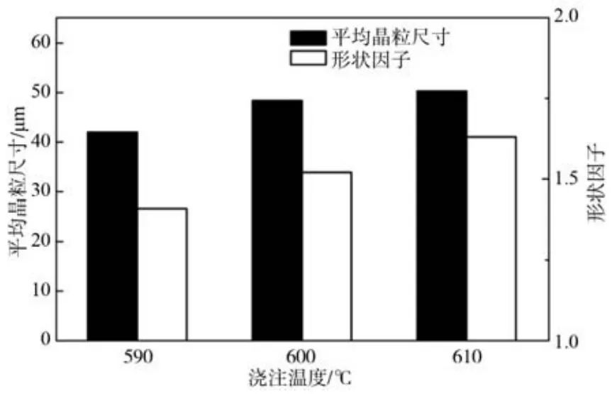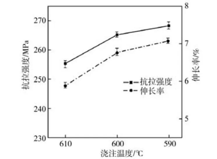 圖4 AlSi9Cu合金在不同澆注溫度下的平均晶粒尺寸及形狀因子 2.2 力學(xué)性能 圖5所示為本試驗(yàn)測(cè)試的不同澆注溫度下制備的機(jī)械用半固態(tài)壓鑄AlSi9Cu鑄態(tài)試樣的抗拉強(qiáng)度與伸長(zhǎng)率。從圖5可以看出,隨著半固態(tài)壓鑄AlSi9Cu合金制備過程中澆注溫度的降低,合金的抗拉強(qiáng)度與伸長(zhǎng)率均呈現(xiàn)為升高趨勢(shì)。當(dāng)半固態(tài)壓鑄AlSi9Cu合金的澆注溫度為610 ℃時(shí),抗拉強(qiáng)度為255.26 MPa,伸長(zhǎng)率為5.79%;隨著半固態(tài)壓鑄AlSi9Cu合金的澆注溫度降低至600 ℃,抗拉強(qiáng)度增加到264.14 MPa,伸長(zhǎng)率升高至6.73%;隨著半固態(tài)壓鑄AlSi9Cu合金的澆注溫度進(jìn)一步降低到590 ℃時(shí),抗拉強(qiáng)度達(dá)到最大值,為268.03 MPa,伸長(zhǎng)率也同樣升高至最大值,為7.05%。結(jié)果表明,澆注溫度對(duì)機(jī)械用AlSi9Cu合金半固態(tài)壓鑄件的抗拉強(qiáng)度和伸長(zhǎng)率均有著明顯的影響。