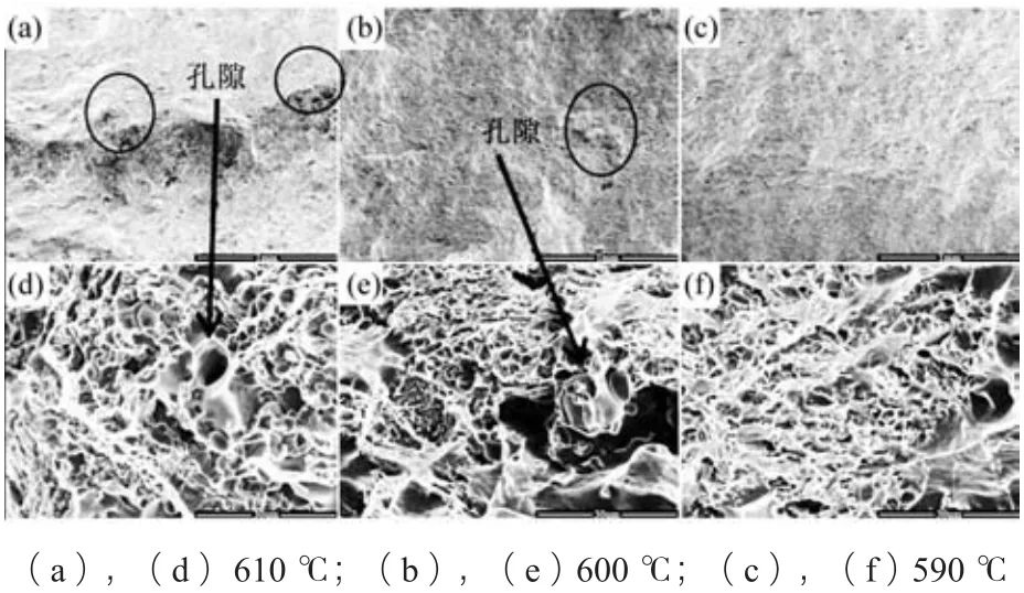 圖5 AlSi9Cu合金在不同澆注溫度下的力學(xué)性能 眾所周知,鋁合金的力學(xué)性能與其顯微組織密切相關(guān),半固態(tài)壓鑄AlSi9Cu合金的力學(xué)性能是由其顯微組織中的含氣量及其晶粒尺寸等因素共同決定的,由圖3中半固態(tài)壓鑄AlSi9Cu合金的顯微組織觀察分析結(jié)果可以看出,機(jī)械用半固態(tài)壓鑄AlSi9Cu合金的平均晶粒尺寸隨著澆注溫度的升高而逐漸變大,因此本試驗(yàn)繼續(xù)對(duì)半固態(tài)壓鑄AlSi9Cu合金拉伸試樣斷口形貌進(jìn)行掃描分析,來觀察合金的含氣情況,圖6為不同澆注溫度下半固態(tài)壓鑄AlSi9Cu合金的斷口形貌觀察結(jié)果。從斷口形貌可以看出,當(dāng)合金的澆注溫度為610 ℃時(shí),合金中存在著明顯的卷氣缺陷,而當(dāng)澆注溫度為600 ℃時(shí),斷口中觀察到的氣孔缺陷呈減少的趨勢(shì),直到將澆注溫度降低至590 ℃時(shí),斷口中幾乎觀察不到明顯的氣孔存在。
