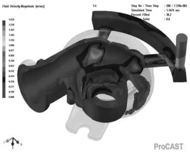 圖5 澆注系統各部分的橫截面及其尺寸 3.鑄造工藝的初步模擬與分析 利用ProCAST軟件對該壓殼鑄件的初步工藝進行了模擬,其充型凝固過程模擬結果如圖6和圖7所示。