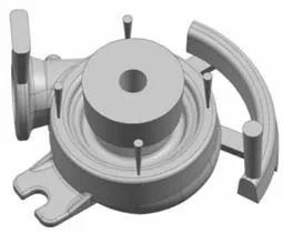 ![]() 原標題:壓殼鑄件的鑄造工藝設計及試生產 摘要:壓殼鑄件應用于許多流體工程領域中。根據壓殼鑄件的結構特點,首先基于其CAD圖利用UG軟件對該鑄件進行了三維建模,然后設計其鑄造工藝方案,并利用數值模擬軟件ProCAST進行了工藝方案優化,分析了鑄件的充型過程、凝固過程及縮孔、縮松缺陷分布等,最終確定了壓殼鑄件的最佳鑄造工藝方案。再采用樹脂砂利用數字化無模精密鑄造成形機加工出砂型及砂芯,然后合型,熔煉金屬液,進行實際澆注,對壓殼鑄件進行了試生產。所獲得的鑄件完全符合圖紙的技術要求,為該壓殼鑄件采用重力鑄造方法進行下一步中試生產奠定了工藝基礎,同時也為其他壓殼類鑄件的鑄造工藝設計提供了一定參考。 壓殼鑄件在實際工程領域中有著廣泛應用,它的主要作用是通過將流體吸入其內部,將流體的動能轉化為壓力,從而實現其整體的壓力平衡,因此壓殼鑄件需要具有一定的強度,并且在使用前要進行水壓強度實驗和氣壓滲漏性實驗。由于壓殼鑄件內部中空,因此需要用砂芯來進行成形。數字化無模精密鑄造成形技術無需制造模具或模樣,具有生產周期短、工藝試制成本低、數字化程度高、綠色化程度好等特點,特別適合于鑄件的工藝開發和生產試制。文中利用CAD/CAE/CAM技術以及數字化無模精密鑄造成形技術,進行了鋁合金壓殼鑄件的三維造型、鑄造工藝設計及優化,最終進行了生產試制。 1.鑄件的結構特點及要求 該壓殼鑄件的基本尺寸為157.8 mm×151.1 mm×64.6 mm,材質為AlSi7Mg0.3,重量為0.91 kg,鑄件的三維模型及主要尺寸如圖1所示,屬于小型復雜件。其技術要求包括:未注鑄造公差應符合BS6615/ISO 8062及工程標準E3-20,缺陷需符合工程規范E4-05-006,鑄件需符合材料規范中的相關質量要求。該鑄件的最小壁厚為4 mm,多個面要求不允許存在飛邊、毛刺和凸起,因此需要著重考慮好澆注位置和分型面;此外,該鑄件最大截面不在同一平面上,因此要合理設計好分型面。