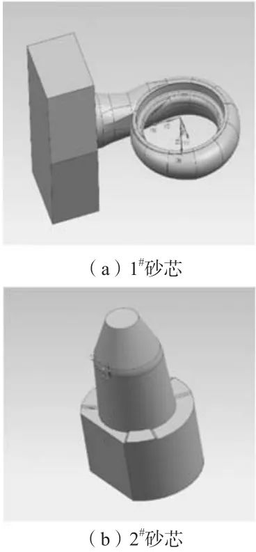 圖2 澆注位置和分型面 2.2 砂芯及澆注系統設計 根據鑄件結構,設計了兩個砂芯,如圖3所示。