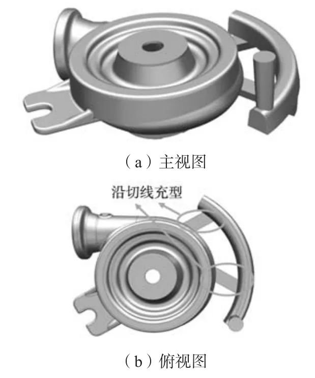 圖3 兩個砂芯的三維模型圖 由于該件為小型鑄鋁件,在查鑄造手冊和相關資料后得知,鑄鋁件主要采用開放式澆注系統。開放式澆注系統在充型時可以保證充型液流速度低,從而充型平穩,還可以避免紊流和氧化膜卷入,從而保證進入型腔中的金屬液相對純凈,故本次工藝采用開放式澆注系統,各澆道截面比為ΣA直 ∶ΣA橫 ∶ΣA內 =1∶1.4∶1.3。而且,采用中注式澆注系統,金屬液從中部流入型腔。由于該件結構為渦輪殼體結構,易在充型過程中產生卷氣的現象,因此側邊注入式的內澆道部分采用沿切線方向進行充型,這樣可以減輕卷氣,同時更有利于金屬液平穩地進入型腔。澆注系統的形狀如圖4所示。