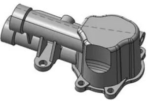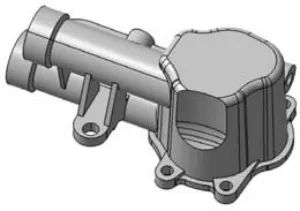 圖11 充型過程和凝固過程的溫度場 可以看出,在充型時,兩股金屬液匯入一起,未出現(xiàn)臺階面的情況,并且在液面升到上側的薄壁部分時,金屬液平穩(wěn)上升,未出現(xiàn)紊流、飛濺的現(xiàn)象。在凝固時,除了較遠處先進行凝固之外,由于冷卻系統(tǒng)的加入,出現(xiàn)縮孔的部位在周圍較薄的部位開始凝固之前已經(jīng)開始發(fā)生凝固,在周圍薄壁部分失去補縮能力后。同時,由于加工余量的設置,加工孔位置厚度增加,導致該處凝固緩慢,對周圍進行補縮。同時,由于左側澆注位置的改變,在凝固到底部兩個圓筒時,澆注口距離圖7F處預測會產(chǎn)生縮孔位置較近,可以有效的進行補縮。 工藝優(yōu)化成形后鑄件的縮松、縮孔分布如圖12所示,可以看出,由于工藝方案的改進,底部的縮松、縮孔全部轉移到了孔加工的部位,其他部位的縮松、縮孔也由于冷卻系統(tǒng)的增加得到了消除。 為進一步驗證優(yōu)化后的變速器操縱盒工藝方案的可行性,根據(jù)上述優(yōu)化方案對產(chǎn)品進行試制,試制產(chǎn)品如圖13所示,經(jīng)檢驗,產(chǎn)品整體質(zhì)量較好,內(nèi)外表面無裂紋、縮松、縮孔等缺陷,并且將零件剖開,觀察易產(chǎn)生縮松、縮孔的圖7中的F和G處,也無缺陷產(chǎn)生,與上述模擬結果相吻合,說明澆注系統(tǒng)和冷卻系統(tǒng)的優(yōu)化設計較為合理。