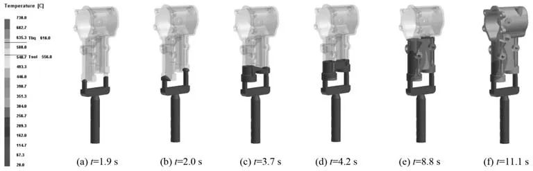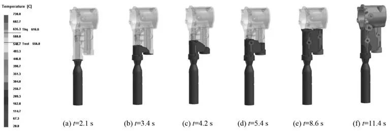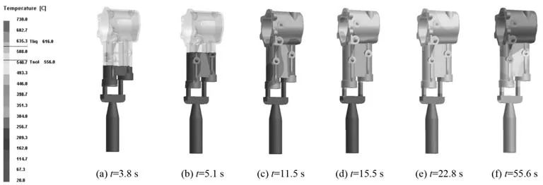 表2 冷卻水管參數(shù) 4.2 方案驗證 對優(yōu)化后的工藝方案進行數(shù)值模擬,充型過程和凝固過程的溫度場如圖11所示。