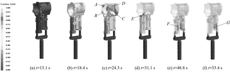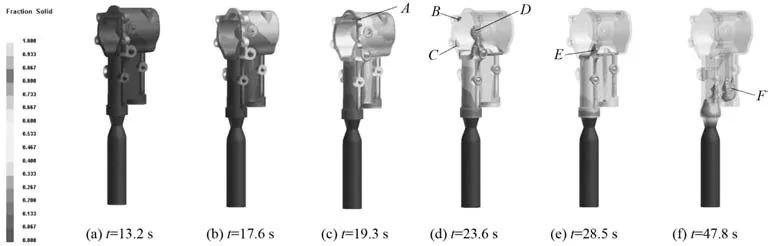 圖5 方案二的充型過程 在進行充型時,兩種方案都比較符合一般低壓鑄造的自下而上的填充,但是方案一在充型時鋁液在壁厚變化較大的部位出現(xiàn)臺階面,方案二較為合理,但還需再做進一步優(yōu)化,且充型都提前完成,因此需要對壓力曲線進行修改。 3.2.2 凝固過程和缺陷的分析 在凝固過程中,金屬液在型腔中逐漸結晶,形成固液共存的狀態(tài),金屬液存在一個臨界固相分數(shù),當超過此臨界值,金屬液流動性將變差,以至于失去補縮能力,理論上取臨界固相分數(shù)值為0.7。因此對兩種方案的凝固過程主要分析固相率變化,方案一和方案二的凝固情況分別如圖6和圖7所示。
