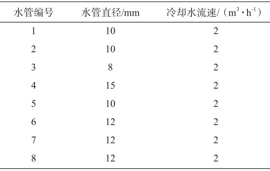 圖8 兩種方案的縮松、縮孔所在位置 4.工藝優(yōu)化 4.1 優(yōu)化方案 綜合比較兩種澆注系統(tǒng),方案二較方案一在充型過程中較為合理且縮松、縮孔體積較小,所以選擇方案二并對其進行進一步工藝優(yōu)化。 在充型過程中,針對在鋁液充型30%的時候出現(xiàn)的短暫臺階面,調(diào)整兩個內(nèi)澆道的截面積,但保證總面積不變,這樣使得充型到該處時兩側液面更平穩(wěn),減少因金屬液紊流、飛濺而導致的氣孔、氧化夾渣等缺陷。針對圖7F處產(chǎn)生的較大縮孔,調(diào)整左側內(nèi)澆道的位置,這樣澆道位置與出現(xiàn)缺陷的F處較近,便于補縮,改善此處內(nèi)縮孔情況。 由于距離澆口遠處的薄壁部分厚度較為不均,較厚的部位在凝固之前周邊部位已經(jīng)凝固,無法進行補縮,針對由于此原因產(chǎn)生的縮孔,采用添加冷卻系統(tǒng)的方法,調(diào)整凝固時溫度場的分布,得到較好的凝固順序。冷卻系統(tǒng)采用水冷的方式,水溫選擇15 ℃。 對于孔部位的缺陷,由于此處厚度差異較大,因此在此處添加冷卻水管效果不太顯著,因此可以將孔處添加加工余量,將孔填上,后續(xù)再進行孔加工,添加的加工余量可以起到補縮的作用,再通過冷卻水管將縮松、縮孔的位置調(diào)整在加工余量范圍內(nèi),后續(xù)孔加工時進行去除。 綜上所述并結合數(shù)值模擬,優(yōu)化后的澆注系統(tǒng)優(yōu)化結果和具體的冷卻分布位置如圖9和圖10所示,冷卻水管的參數(shù)如表2所示。