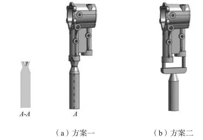 式中:∑A內(nèi) 為內(nèi)澆道的總截面積,G為零件的質(zhì)量,ρ為合金液的密度,v為充填速度,t為充填時間。合金液密度為2.4 g/m³ ,取充填速度為15 cm/s,t可以通過型腔高度與型腔內(nèi)金屬液升高速度比值確定,由于平均壁厚為4.6 mm,根據(jù)經(jīng)驗取充填速度2 cm/s,通過計算得出內(nèi)澆道的截面積為188 ㎡ 。 根據(jù)常見的澆注系統(tǒng)中組元的截面面積比例關系可得,∑A內(nèi)∶∑A橫∶∑A直=1.0∶(1.5~1.7)∶(2.0~2.3)。通過經(jīng)驗和模擬計算總結,取∑A內(nèi)∶∑A橫∶∑A直=1.0∶1.7∶2.3。因此本次鋁合金操縱盒低壓鑄造的橫澆道和直澆道的截面積分別為320 ㎡ 和432 ㎡ 。 2.2.2 升液管設計 升液管目前多采用鑄鐵材料,但是鑄鐵材料壽命短易腐蝕并且會導致金屬液增鐵,所以本次使用陶瓷升液管,升液管的高度以升液管底端距坩堝底部距離為基準設定。 2.2.3 澆注系統(tǒng)設計 低壓鑄造的澆注系統(tǒng)結構必須充分考慮低壓鑄造自下而上的填充順序和自上而下的凝固順序,且通過設計底注式澆注系統(tǒng),保證鐵液上升時充型平穩(wěn),減少因紊流產(chǎn)生的氧化夾渣。本文共提出兩種澆注系統(tǒng)方案,其中方案一為單升液管單澆道,受零件形狀的限制,內(nèi)澆道設計成環(huán)狀澆道;方案二為單升液管多澆道,內(nèi)澆道為橢圓形澆道。結合上述計算的澆注系統(tǒng)的截面積大小,設計出方案一和方案二的澆注系統(tǒng)如圖3所示。