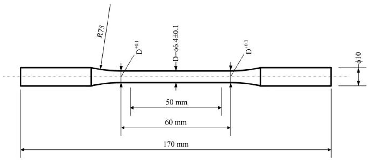 表1 新型壓鑄合金的化學成分(%) 1.2 壓鑄試樣的制備 壓鑄試樣參照標準設計,試樣見圖1,試樣尺寸見圖2,直徑為6.4 mm,標距為50 mm,總長為170 mm。采用臥式冷室壓鑄機,沖頭直徑為40 mm。壓鑄工藝參數:澆注溫度為660~670 ℃,模具溫度為150 ℃。