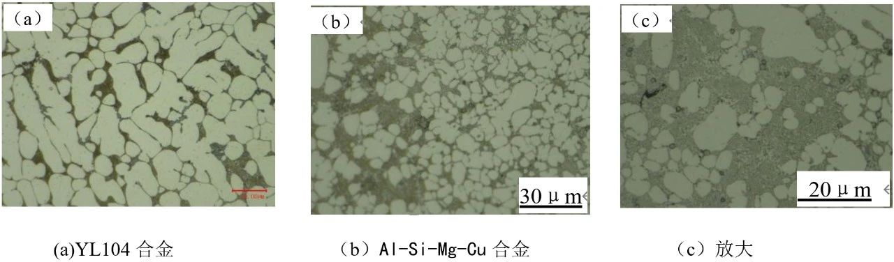 圖3 YL104合金與Al-Si-Mg-Cu合金的金相組織照片 圖3為YL104壓鑄合金和Al-Si-Mg-Cu合金的組織對比,可以看出,兩種合金中白色組織為α-Al基體,枝晶間灰色組織為共晶組織,但Al-Si-Mg-Cu合金中α-Al基體更加圓整,尺寸明顯變小,最小可達到3μm。其中圖3c中能發現部分粗大的α-Al,這部分粗大的枝晶應該是在壓室內形成的,在壓室內凝固、長大,最后被沖頭壓入型腔形成的。由于放大倍數的限制,還有部分黑色未知組織需進行更細微的分析。 根據Al-Si-Cu相圖,當Mg含量為0.5%,銅含量≤0.5%時合金凝固后相組成為[α-Al+Si+Mg2Si+Al5Mg8Cu2Si6],由于Mg、Cu、Zn等合金元素含量較少,添加的Mg、Cu、Zn等合金元素大部分都溶解于Al基體中,因此在微觀組織照片中很難發現以上元素形成的特征相。通過EDS分析發現α-Al基體中溶有Mg、Cu、Zn、Si等合金元素,起到固溶強化的作用,見圖4。
