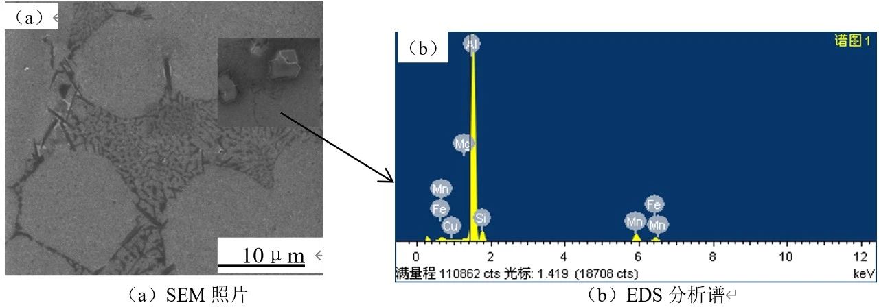圖4 Al-Si-Mg-Cu合金微觀組織與EDS分析 通過SEM進一步分析,可以觀察到黑色的纖維狀組織和塊狀的亮灰色組織,見圖5。經EDS分析(Al的質量分數為82.2%,Si的質量分數為16.2%),纖維狀組織為共晶Si,由于合金在熔煉階段加入了Sr變質,Sr將原本細長的板條狀共晶Si變為細小的纖維狀結構,細化后的共晶硅尺寸在2μm左右,Sr的加入極大地削弱了共晶Si對基體的割裂作用。亮灰色組織為Fe相。在鋁硅系合金中鐵相主要以漢字狀α-AlFeSi和針狀β-AlFeSi相存在。根據SEM觀察,發現此Fe相為塊狀,判斷此相并不是上述兩種相。根據Lin Chong等研究,在Al-Si合金添加Mn后發現有塊狀的Fe相Al4(Fe,Mn)Si2生成,經過T6熱處理后轉變為塊狀的Al5(Fe,Mn)Si。本研究的合金Si含量為9%,通過EDS譜分析(Al的摩爾分數為74.52%,Fe的摩爾分數為4.49%,Mn的摩爾分數為8.23%,Si的摩爾分數為12.11%),綜合鐵相的形貌,認為此組織為Al5(Fe,Mn)Si。由于Mn的影響,形貌得到了改善,對于基體的割裂效果明顯減弱。綜上所述,鑄態的合金微觀組織主要由細化的α-Al、纖維狀的共晶Si和塊狀的Fe相組成。