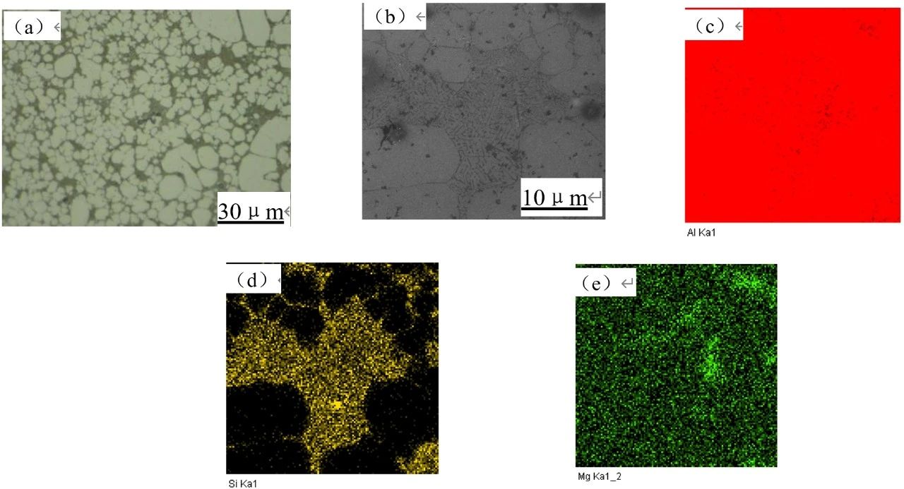 圖6 140℃時效后Al-Si-Mg-Cu合金的微觀組織和元素分布:(a)金相照片(b)SEM照片(c)Al元素分布(d)Si元素分布(e)Mg元素分布 圖6為140℃ 時效后Al-Si-Mg-Cu 合金的微觀組織和元素分布。可以觀察到時效后的微觀組織主要還是初生α-Al和共晶Si相,對比圖3b,發現時效對于初生α-Al的形貌大小基本沒有影響,都是由細小的α-Al枝晶和少數粗大的α-Al枝晶組成。通過SEM分析可以發現(圖6b),在α-Al出現了一些彌散分布的黑色組織,經EDS分析(圖6c、圖6e),此組織主要由Al與Mg組成,結合胡祖麒等的研究,Al-Mg-Si系合金生成的β-Al8Mg5相經過時效處理后會重新固溶到鋁基體中,起到固溶強化的作用,分析此組織β-Al8Mg5相。 對時效后的組織進行了EDS分析,見圖7。從圖7a可見,在共晶Si中間有一圈灰色的環狀組織,組織主要構成元素為Si和Mg,分析認為是Mg2Si相;在圖7a左上角和正中間位置還存在形狀不規則的灰色組織,通過圖7b的EDS分析(Mg摩爾分數為4.24%,Cu摩爾分數為1.10%)和元素分布圖,發現該組織由Al、Mg、Si、Cu組成,且Mg與Cu摩爾比為4:1,因此判斷該組織為Al5Mg8Cu2Si6相。在壓鑄時,Mg、Cu等元素由于含量較少能夠完全溶解于基體中,經過時效處理,溶解于基體的強化相析出起到彌散強化的作用。Zn在鋁中有很大的溶解度,因此Zn主要起固溶強化的作用。綜上所述,時效處理后的合金組織主要有細小的α-Al、均勻分布的鈍化共晶Si、彌散分布的Mg2Si相和少量的Al5Mg8Cu2Si6相組成。
