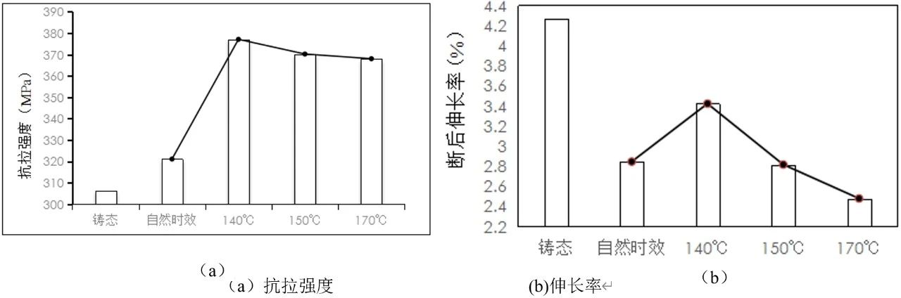 圖8 時效后合金的力學性能 2.3.2 時效處理對合金性能的影響 自然時效處理的試棒平均抗拉強度為321.077 MPa,伸長率平均為2.842%;經過不同溫度的人工時效發現,在140 ℃下進行人工時效處理的試棒平均抗拉強度最高,為377.081 MPa,此時伸長率平均為3.42%,抗拉強度隨人工時效溫度提高呈下降趨勢,伸長率也隨時效溫度的升高而降低。Al-Si-Mg-Cu合金在凝固后主要相組成為[α-Al+Si+Mg2Si+Al5Mg8Cu2Si6],時效處理對于α-Al相的形貌、大小影響不大,但是時效處理過程促進了原子的移動和擴散,改善了鑄件因為局部冷卻過快導致的局部成分偏析和局部應力,同時也緩解了鑄件內部的殘余應力,從而降低了鑄件局部應力集中,這使得合金強度上升的同時,伸長率還能保持相對穩定。另外,時效處理后會析出Mg2Si相和少量的Al5Mg8Cu2Si6相,這些強化相彌散分布于晶界間,起到彌散強化的作用從而提高強度。 隨著時效溫度的提高,強化相析出越多,因此人工時效相對自然時效強度會上升,當溫度達到一定值之后,析出相會偏聚長大,破壞基體完整性從而導致強度下降,因此隨著溫度升高強度下降;析出相增多導致合金在變形時阻力增大,所以合金塑性降低,伸長率隨時效溫度升高下降。