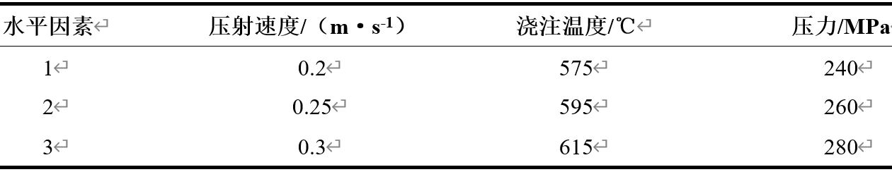 在鋁合金半固態流變壓鑄成形過程中,壓射速度、澆注溫度和壓力對鑄件本體組織和拉伸性能有較為顯著的影響。為通過較少的試驗量探索壓射速度(0.2~0.3 m/s)、澆注溫度(575~615 ℃)和壓力(240~280 MPa)對鑄件的平均晶粒尺寸、平均形狀因子、屈服強度、抗拉強度和伸長率的影響,采用正交法進行試驗方案設計,比較了各工藝參數的重要性,并確定最優工藝。正交設計因素水平表見表1。