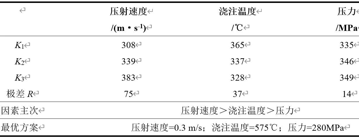 (3)隨著壓射速度由0.2 m/s升高至0.3 m/s,組織由粗大的薔薇晶逐漸演變為細小的球狀晶,力學性能提升,壓射速度為0.3 m/s時達到最大值;隨著澆注溫度由615℃降低至575℃,組織由片狀及針狀演變為細小均勻的顆粒狀,澆注溫度為575℃時達到最大值;隨著壓力由240 MPa提升至280 MPa,晶粒趨于細小圓整,力學性能提升,壓力為280 MPa時達到最大值。