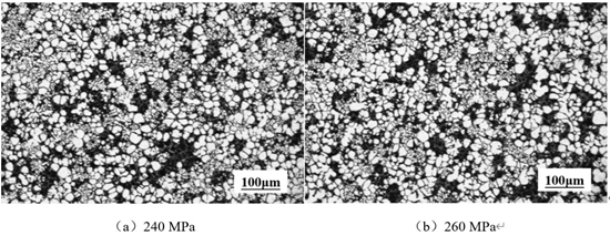 另一方面,在壓力作用下,熔體可以始終與模具內壁和壓頭保持密切接觸,從而能始終保持漿料與模具之間的高效傳熱。并且隨著壓力增大,漿料與型壁的貼合度更高,凝固速度更快,有利于晶粒細化。因此隨著壓力增大,鑄件組織由粗大的薔薇晶轉變為細小的球狀晶。綜上,當壓力在240~280 MPa范圍內,隨著壓力升高,熔體的過冷度增加,傳熱效率變高,凝固速度加快,組織趨于細小圓整。