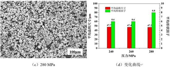 圖8為Al-Si-Mg鋁合金半固態流變壓鑄件在壓射速度為0.3 m/s、澆注溫度為595 ℃,不同壓力(240、260、280 MPa)條件下的金相組織及其變化,見圖8。研究表明,增大壓力對球狀晶的形成有促進作用[13]。可以看出,隨著壓力增加,薔薇狀晶粒逐漸被球狀晶所替代。當壓力為240 MPa時,平均晶粒尺寸為47.7 μm,平均形狀因子為0.6,晶粒主要呈薔薇狀;當壓力提升至260 MPa時,部分薔薇晶演變為球狀晶,且晶粒尺寸明顯減小,平均晶粒尺寸和平均形狀因子分別為47.4 μm和0.6;當壓射速度提升至280 MPa,球狀晶明顯增多,平均晶粒尺寸和平均形狀因子達到47.2 μm和0.8。