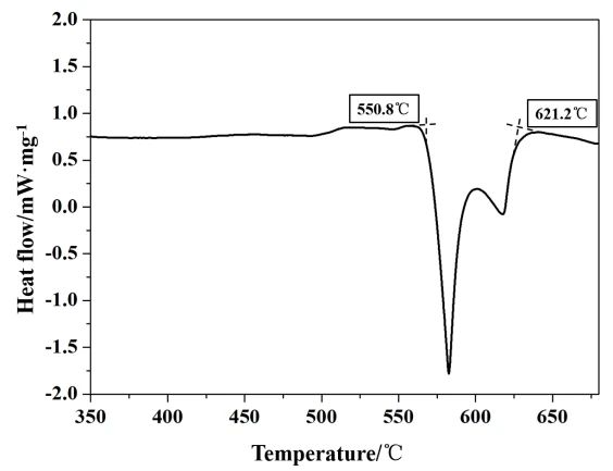 鑄件本體化學成分的測定采用電感耦合等離子譜分析法(ICP),結果見表2,測試所需顆粒樣本取自本體側壁與底部等不同位置。采用NETZSCH STA449C綜合熱分析儀對坯料進行差示掃描量熱分析(DSC),如圖2所示,采用外推法、終點法,確定坯料的固相線和液相線溫度分別為556.3 ℃和615.8 ℃,因此本文討論的澆注溫度為575、595和615 ℃。