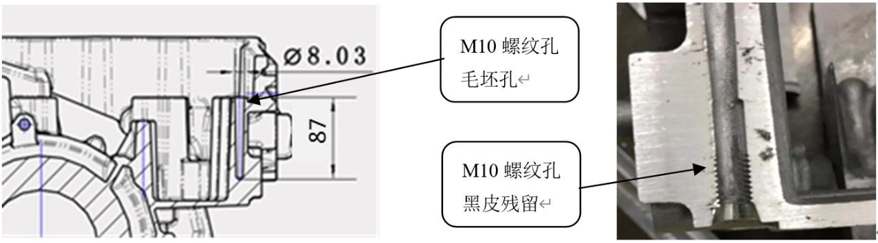 圖10 改善后超點(diǎn)冷針設(shè)計 (2) 問題2:產(chǎn)品高壓油道孔,毛坯孔大端直徑為8 mm,深87 mm,加工完成后,前部M10螺紋孔出現(xiàn)黑皮殘留,螺紋孔內(nèi)1/4周無螺牙,該批次發(fā)生比例達(dá)47%,嚴(yán)重影響產(chǎn)品的裝配和密封性能,導(dǎo)致批量報廢。螺紋不良見圖11。